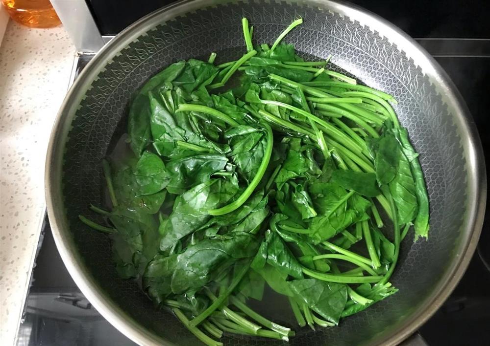 2. Cho một lượng nước thích hợp vào nồi, sau đó cho cải bó xôi vào chần qua rồi vớt ra rổ cho ráo nước.