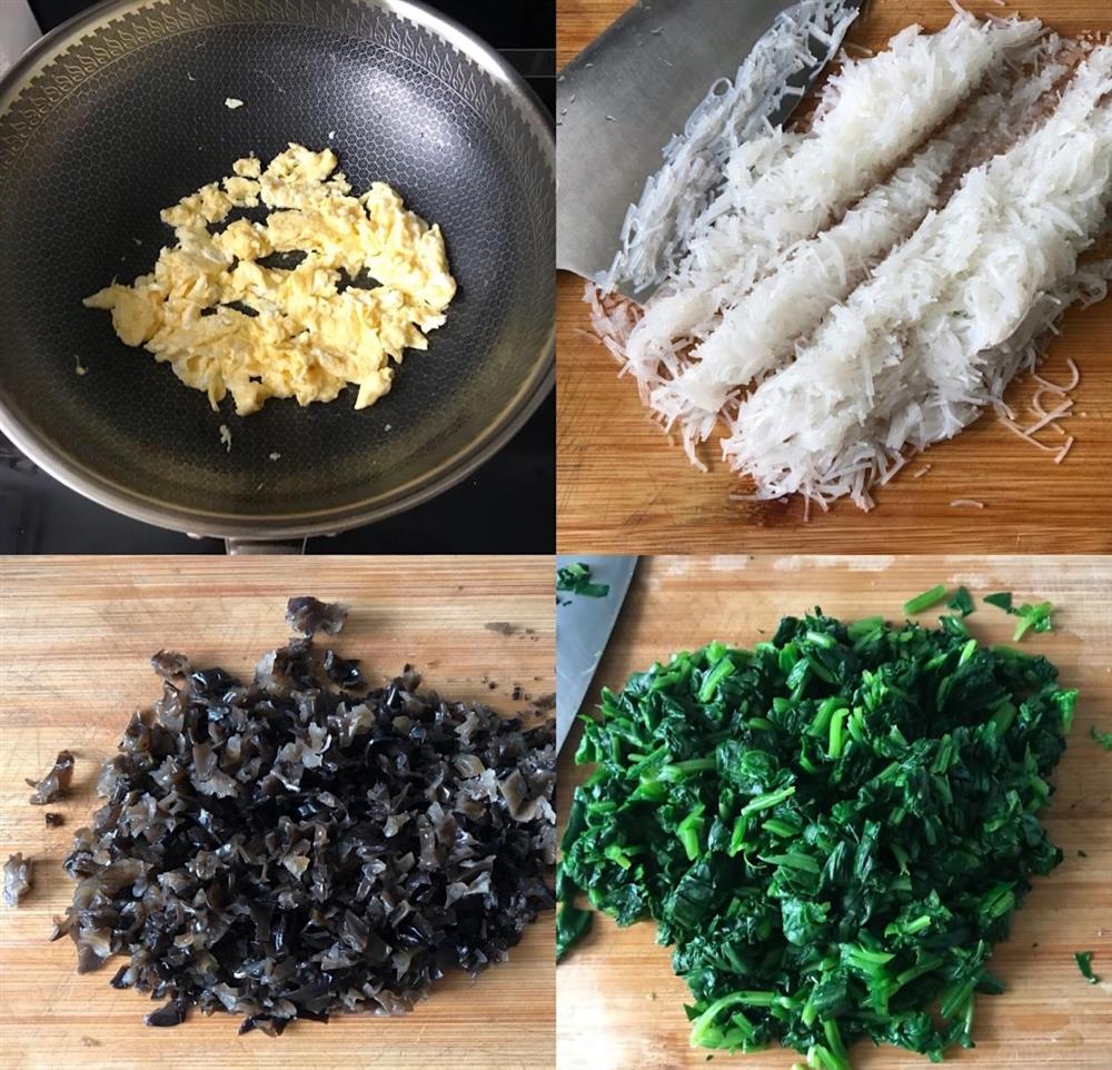 3. Trứng xào cho chín, các nguyên liệu như mộc nhĩ, miến, cải bó xôi thái nhỏ.