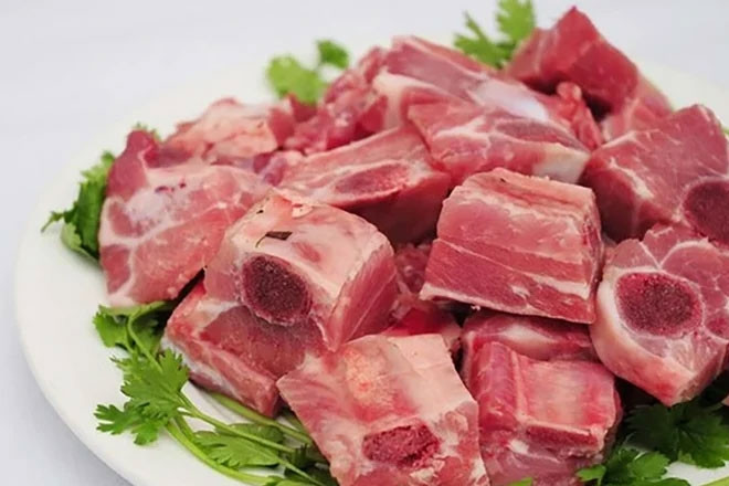 Sườn non rửa sạch, chặt miếng vừa ăn. Bắc chảo lên bếp cùng 500ml nước, đun sôi rồi cho sườn heo vào chần từ 5 – 7 phút thì vớt ra để ráo.