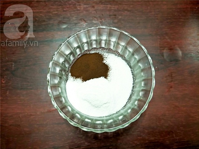 Bạn cho bột thạch vào 1 cái bát, thêm đường, bột cà phê và trộn đều lên.