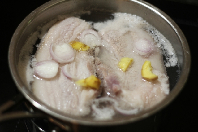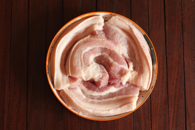 Bạn rửa sạch thớt và dao, tráng qua nước sôi để chuẩn bị thái thịt. Sau bước vệ sinh thớt, bạn cho miếng thịt lên thớt, dùng dao thái thịt ba chỉ thành các miếng con chì. Sau đó, bạn chần sơ phần thịt này với nước cùng chút muối, hành khô đập dập cho thơm và loại bỏ vật chất. Sau khi đã sôi, bạn tắt bếp và vớt thịt ra rửa thật sạch với nước sôi để nguội và để ráo nước.