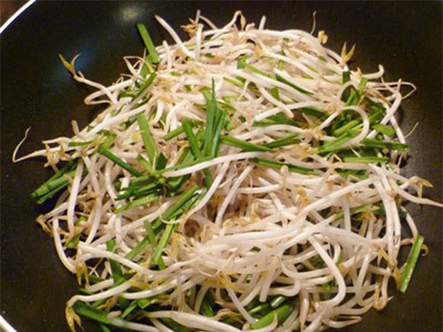 - Bước 4: Cho chảo lại lên bếp vẫn để lửa to cho giá vào xào, nêm gia vị muối, chút hạt nêm cho vừa ăn, khi giá chín tái thì cho hẹ và thịt bò vào đảo đều khoảng một phút là được. Rắc tiêu rồi cho ra đĩa, trên rắc tỏi phi.