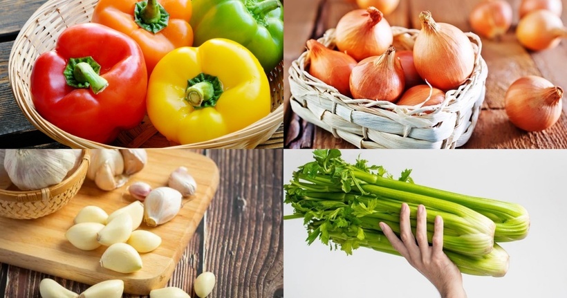 - Rửa sạch ớt chuông, hành tây, cần tây, sau đó thái thành miếng vừa ăn.