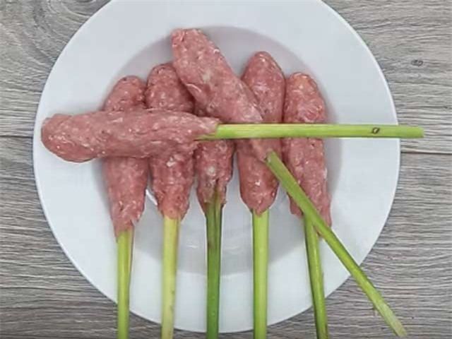 Bước 4: Lấy thịt ra dùng thìa nhỏ múc một ít thịt cho vào giữa từng cây sả và quấn đều phía ngoài cây sả. Làm lần lượt đến khi hết phần thịt và sả.