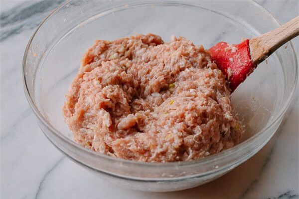 Cho thịt xay và tất cả các loại nguyên liệu cũng như gia vị còn lại vào tô.