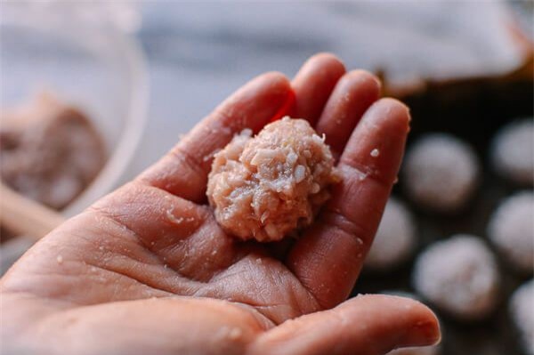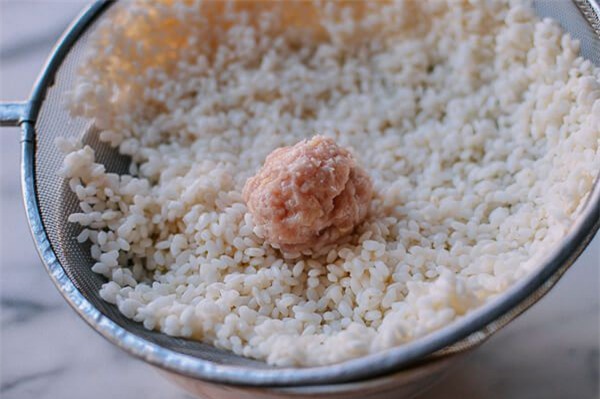 Lăn thịt viên qua gạo nếp. Làm lần lượt cho tới hết thịt.