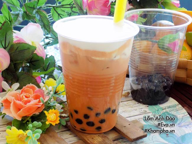 Bước 6: Trình bày: Cho trân châu vào ly, đổ sữa trà Thái + đá đập nhỏ. Cuối cùng cho kem mặn vào là hoàn tất.
