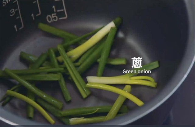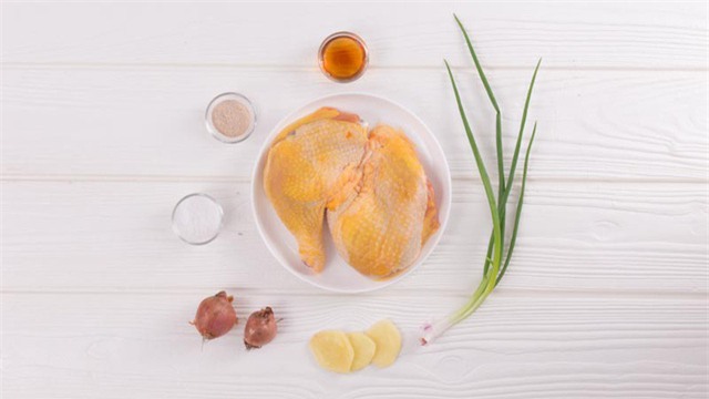 Hành lá thái đoạn dài khoảng 3 – 5 cm, hành tím bóc vỏ, thái nhỏ, gừng rửa sạch, nạo vỏ rồi thái miếng mỏng. Xếp hành lá, hành tím, gừng vào đáy của nồi cơm điện. Đặt thịt gà lên trên, rồi đổ 1 chén rượu nấu ăn vào.