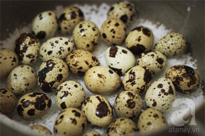 ![]() | ![]() Trứng cút đem rửa thật sạch, đặt lên khăn lau khô hoàn toàn. |