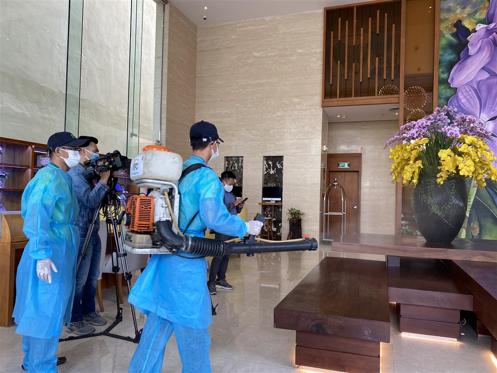 Lực lượng y tế Đà Nẵng phun xịt khử trung ở 1 khách sạn từng có người nhiễm Covid-19 lưu trú