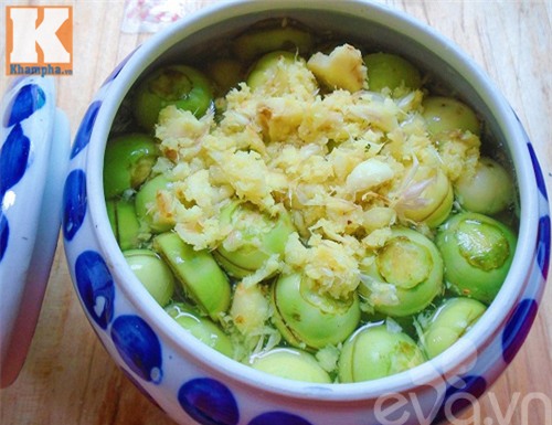 Bước 4: Lần lượt xếp cà pháo vào âu. Cho thêm ớt, riềng, tỏi vào trộn đều. Dùng đĩa nhỏ nén cà lại hoặc đặt một vật nặng lên và đậy nắp lại.