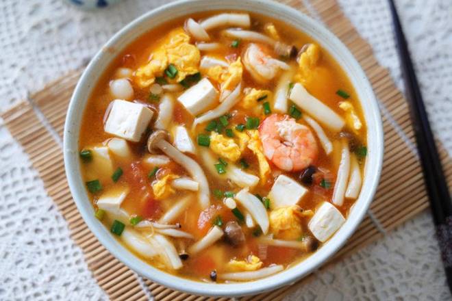 - 2 trái cà chua, 200 gam tôm tươi bóc vỏ, 200 gam nấm hải sản, 1 quả trứng, 2 nhánh hành lá thái nhỏ, vào tép tỏi băm, 1 thìa hạt tiêu, 1 thìa nước tương nhạt, nửa miếng đậu phụ.