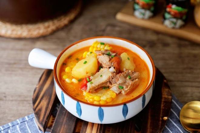Múc canh sườn khoai tây ngô ngọt ra bát, ăn nóng.