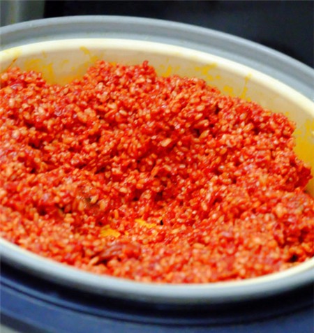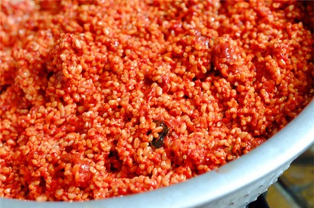 Bước 3: Gạo đổ ra rổ để ráo, cho phần thịt gấc vào cùng, dùng tay bóp hạt gấc và trộn để phần thịt gấc được trộn đều với gạo nếp.