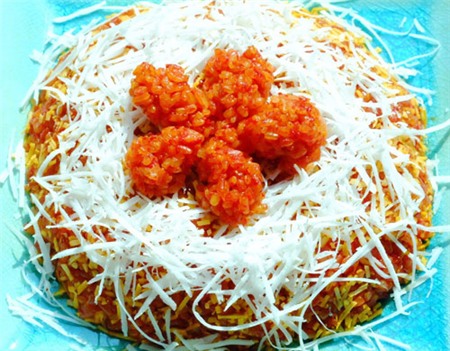 Bước 6: Cho xôi gấc ra đĩa, rắc dừa tươi bào sợi lên ngay lúc xôi còn nóng để ăn cùng.
