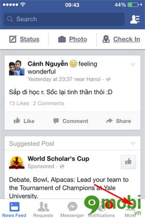 Bước 1 : Chúng ta vẫn khởi động ứng dụng Facebook như trên Android, chọn vào More
