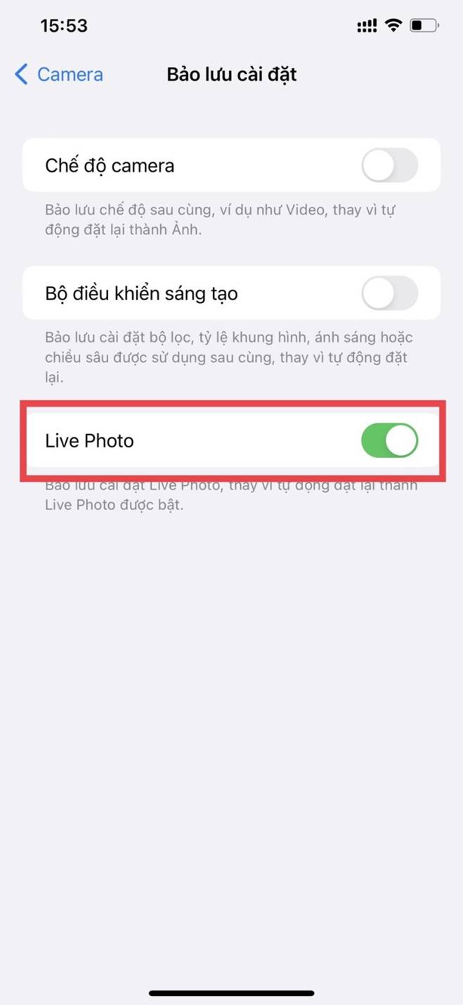 Một mẹo cực đơn giản nhưng rất hữu hiệu để tắt âm khi chụp hình iPhone đó chính là bật chế độ Live Photo. Bạn vào Cài đặt > Chọn Camera > Nhấn vào mục Bảo lưu cài đặt > Nhấn để bật Live Photo.