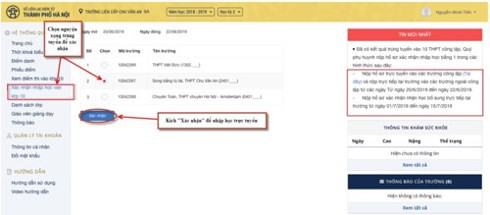Trong danh sách các trường được trúng tuyển, cha mẹ học sinh chọn trường cần nhập học và nhấn nút “Xác nhận”: