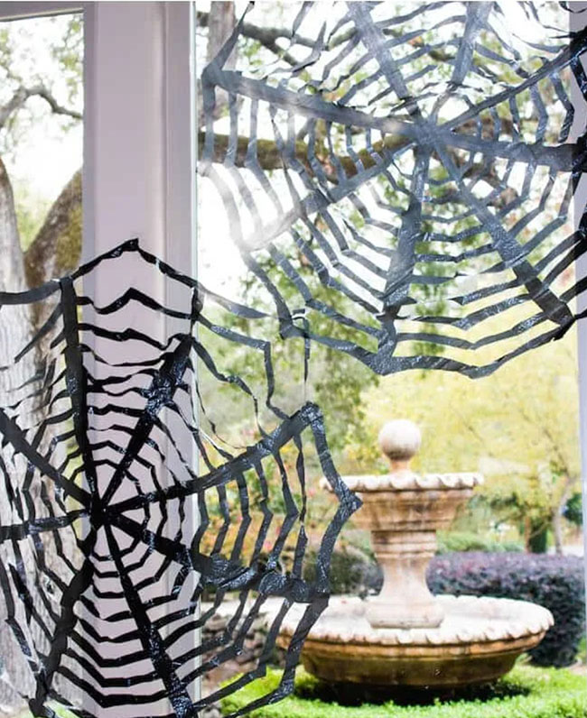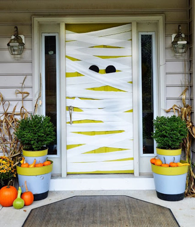 Trang trí cổng nhà cũng là một đặc trưng trong ngày Halloween. Chỉ bằng việc quấn một ít vải trắng ở cửa ra vào thế này cũng đủ dọa khách rồi.