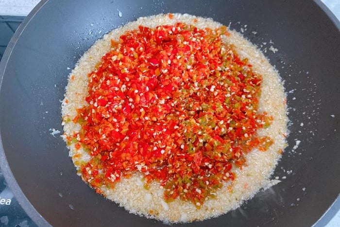 - Cho ớt vào, tiếp tục xào trên lửa nhỏ. Vì ớt chứa nhiều nước nên thời gian xào cần lâu hơn một chút.