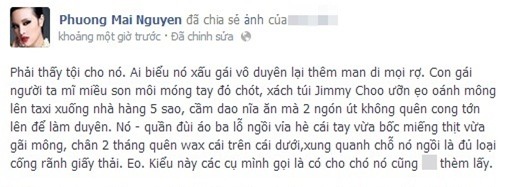 Phương Mai nói rằng: "Phải thấy tội cho nó. Ai biểu nó xấu gái vô duyên lại thêm man di mọi rợ. Con gái người ta mĩ miều son môi móng tay đỏ chót, xách túi Jimmy Choo ưỡn ẹo oánh mông lên taxi xuống nhà hàng 5 sao, cầm dao nĩa ăn mà 2 ngón út không quên cong tớn lên để làm duyên. Nó - quần đùi áo ba lỗ ngồi vỉa hè, cái tay vừa bốc miếng thịt vừa gãi mông, chân 2 tháng... Eo. Kiểu này các cụ mình gọi là có cho chó nó cũng (...) thèm lấy". Ngay sau khi những dòng chia sẻ này của Phương Mai được cô đăng tải, dư luận đã "dậy sóng". Đa phần mọi người đều cảm thấy Phương Mai dù có tài giỏi đến đâu cũng không nên mạt sát người không có cùng quan điểm với mình như vậy. Không chỉ có Phương Mai, cả bạn thân của cô là Nathan Lee cũng "hùa" vào và dùng những câu nói bóng gió với Huyền Chip khiến ai đọc cũng cảm thấy khó chịu.