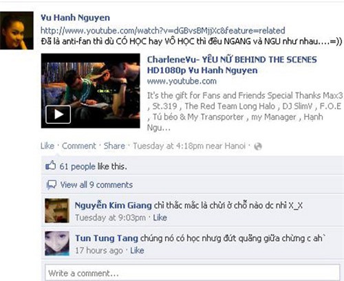 Vũ Hạnh Nguyên công khai chửi anti-fan trên trang cá nhân