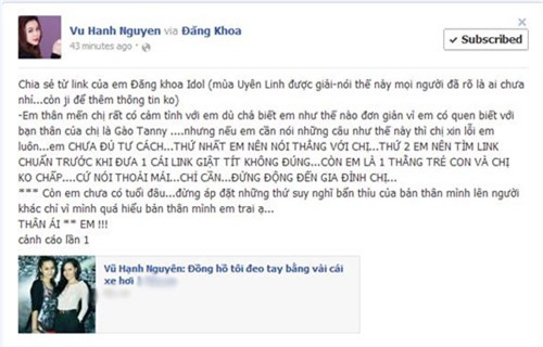 Không chỉ có anti-fan, mà cả những nhân vật khác trong showbiz cũng "lĩnh giáo án" của Hạnh Nguyên khi bàn luận về cô. Đăng Khoa Idol từng có những nhận xét trên trang cá nhân và dẫn link một bài báo viết về Hạnh Nguyên. Ngay lập tức "yêu nữ" chia sẻ về facebook cô kèm theo lời "cảnh cáo lần 1" với cựu thí sinh Việt Nam Idol.
