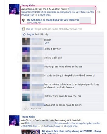 Trang Trần chia sẻ đường link các bài báo về Hà Anh kèm theo những câu bình luận khiến nhiều người "nhức mắt" như: "Có một con khùng trong hình theo mọi người là bánh bèo nào". Hay những từ mạnh hơn như: "Cần phải mua cây cột cho ả đu và liếm...".... Nhiều người cho rằng việc chửi đổng với Trang Trần đã không có gì lạ lẫm. Tuy nhiên, có ý kiến khác lại nói chửi bậy như một thói quen với Trang Trần. Nếu người đẹp ứng xử với dư luận theo cách "động đâu chửi đấy" chắc hẳn ai cũng phải lắc đầu ngán ngẩm mà tránh xa cô.