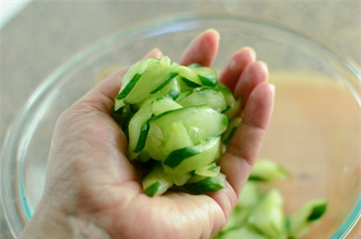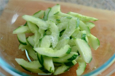 ![]() | ![]() Cắt dưa chuột thành lát mỏng, cho một chút muối vào trộn đều ngâm trong 10 phút. |