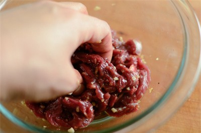![]() | ![]() Thái thịt bò thành từng miếng mỏng, sau đó ướp thịt bò với nước tương, đường, tỏi băm nhỏ, dầu mè và hạt tiêu. |