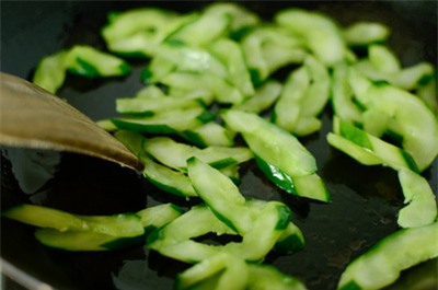 ![]() | ![]() Cho dầu ăn vào chảo, đổ dưa chuột vào xào sơ trong khoảng 1 – 2 phút, đổ ra đĩa. |