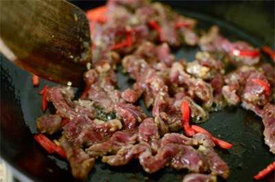 ![]() | ![]() Tiếp tục đổ dầu ăn vào chảo, cho thịt bò và ớt cắt sợi vào xào. |