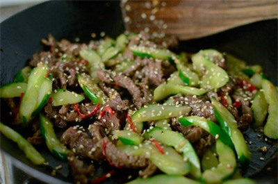 ![]() | ![]() Khi thịt bò gần chín, bạn đổ dưa chuột đã xào sơ vào đảo đều cùng thịt bò. Cuối cùng, rắc chút mè rang vào là bạn đã hoàn thành xong món ăn rồi! |