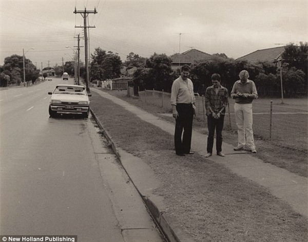 Michael Murdoch, đứng ở giữa bị còng tay và đi chân trần, chỉ chỗ chúng bắt cóc Anita Cobby và ném cô lên xe vào ngày 2/2/1986.