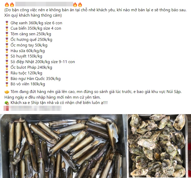 Tôm lớt, tôm hùm, ghẹ giấy, hến cồ đều có giá cực mềm. Ảnh chụp màn hình.