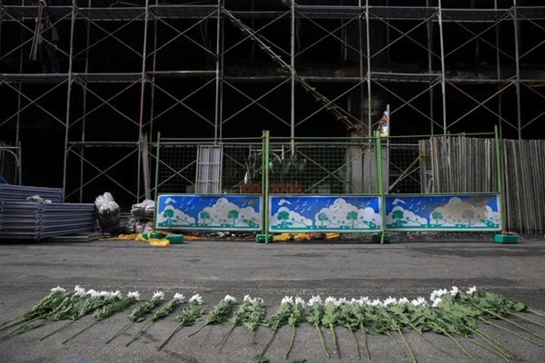 Sáng ngày 15/10, tiếng kim loại chát chúa vang lên khi các công nhân gỡ dàn giáo, tìm cách đục nền nhà cháy đen để xuống các tầng thấp hơn. Mùi khói phảng phất trong không khí. Phía bên ngoài là những chùm hoa trắng do một vài quan chức đến từ sớm đặt lại, trước một tòa nhà quá bi thương.