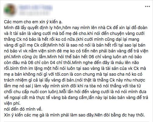 Mình hỏi lại là sao, hắn nói là bán hết rồi. Mình hỏi tiếp “tại sao lại bán?”, hắn bảo vì vợ nằm viện sinh đẻ mẹ không có tiền nên phải bán vàng để trả viện phí. Mình cũng ức lắm. Mình hỏi thế bán hết 6 chỉ vàng luôn à, hắn bảo còn đâu mà 6 chỉ, còn 4 chỉ thôi.