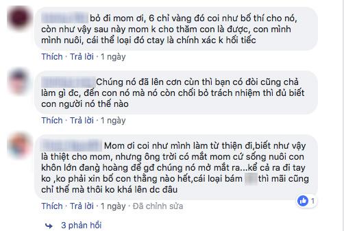 "Đến con là ruột thịt của mình mà còn muốn rũ sạch trách nhiệm, thử hỏi làm sao đối tốt với vợ được. Dù sao cũng chúc mừng bạn đã sáng suốt bước ra khỏi gia đình chồng đó. 6 chỉ vàng, xem như biếu không bạn ạ", một thành viên khác bày tỏ.