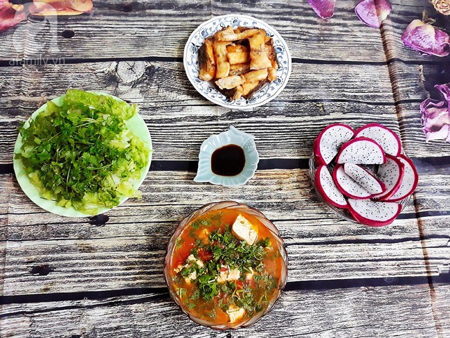 Thứ Ba: Canh cà chua nấu đậu non - Cá chiên giòn - Thanh long