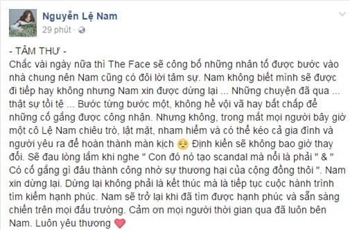 Nguyên văn chia sẻ của Lệ Nam – chị gái Nam Em: “Chắc vài ngày nữa thì The Face sẽ công bố những nhân tố được bước vào nhà chung nên Nam cũng có đôi lời tâm sự. Nam không biết mình sẽ được đi tiếp hay không nhưng Nam xin được dừng lại… Những chuyện đã qua thật sự tồi tệ…