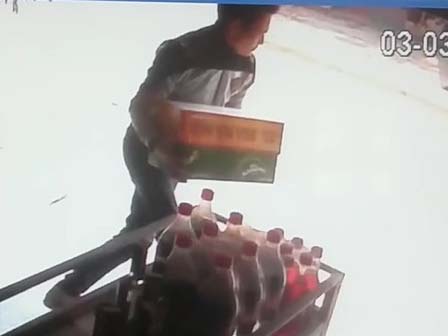 | Nam thanh niên lấy cắp 2 thùng bia của tạp hóa gia đình chị Tâm. Ảnh: Cắt từ clip. |