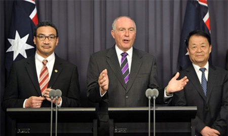 Bộ trưởng Quốc phòng Malaysia Hishammuddin (trái), Phó Thủ tướng Australia Warren Truss (giữa) cùng Bộ trưởng Giao thông Trung Quốc Yang Chuantang trả lời báo chí sau cuộc họp. Ảnh: AFP |