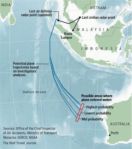 Vị trí ba khu vực chuyến bay MH370 có khả năng rơi xuống nam Ấn Độ Dương. Đồ họa: WSJ. |