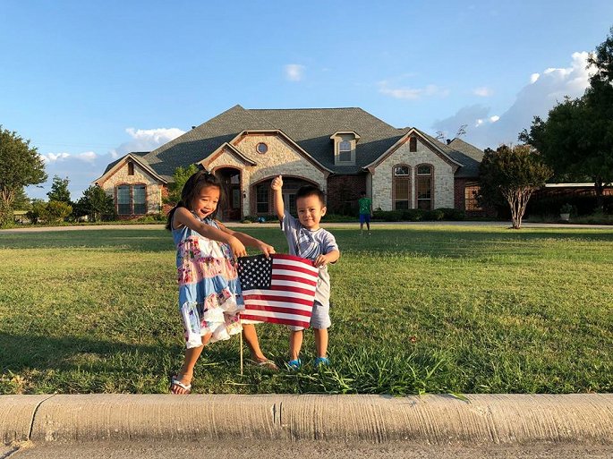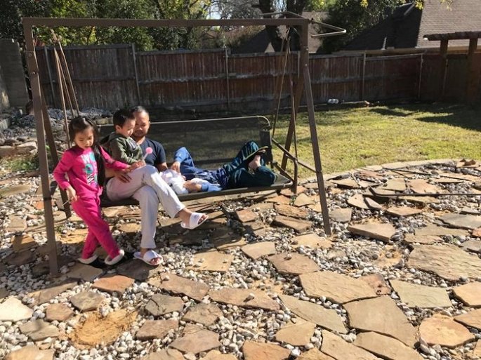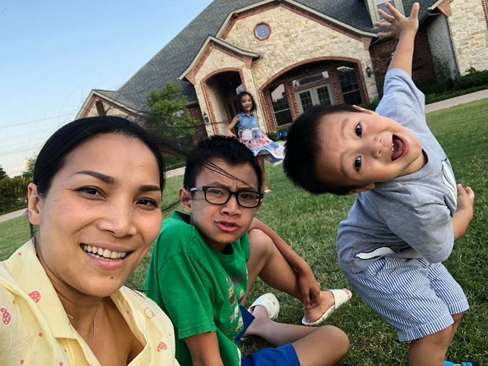 Hồng Ngọc cùng ba con vui chơi trên khoảng sân rộng phía trước ngôi nhà mới mua.