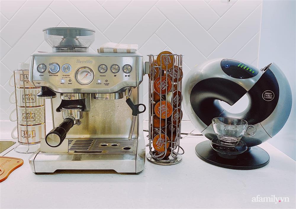 Không gian nấu nướng còn được chị Thúy Hằng mua khá nhiều thiết bị phục vụ cho việc nấu nướng, sinh hoạt của gia đình như máy lọc nước, máy làm sữa hạt, máy ép cam, máy đánh trứng, máy ép chậm, máy nướng bánh mì, máy làm bánh mì, máy pha cà phê hạt, máy pha cà phê sẵn, tủ trữ rượu vang...