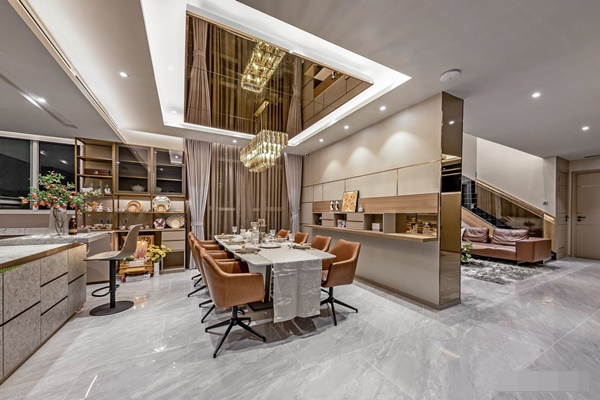 Không gian phòng khách không có ti vi như những thiết kế công năng thông thường mà thay vào đó là không gian mở kết nối với bếp mở và bàn ăn. Để không gian bếp luôn thật gọn gàng, ngăn nắp thì không thể thiếu những hệ tủ có lớp cửa kính lùa. Nhờ vậy, gia chủ tha hồ bày biện thoải mái mà không lo bị xáo trộn, lúc cần gọn gàng thì chỉ cần kéo cửa lùa lại là xong.