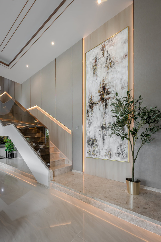 Đi lên các tầng trên là hệ cầu thang với tay vịn bằng kính, kết hợp với các khe hắt đèn trang trí. Đây là chi tiết tạo nên một điểm nhấn kết nối các không gian bên trên - bên dưới một cách tinh tế và thu hút.