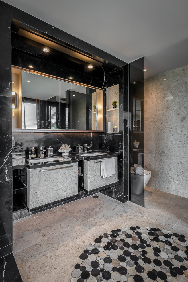 Phòng ngủ master được xem là không gian khá thanh lịch và thư giãn cao. Chủ nhân căn nhà là doanh nhân, nên sau một ngày làm việc, họ muốn không gian nghỉ ngơi phải thật thư giãn. Vì thế, khu vực này ưu tiên thiết kế mở tất các không gian. Từ khu vực tủ quần áo cho đến khu vực nhà tắm đều mang hình thức tự do và bay bổng.