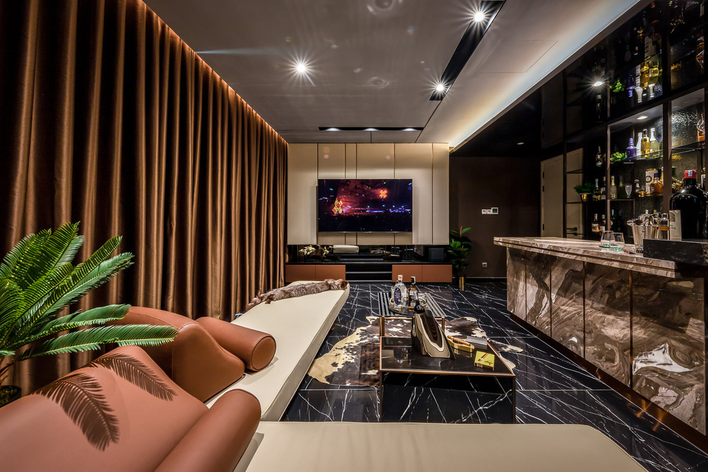 Ngoài ra ngôi nhà còn có cả một không gian giải trí ở tầng cao nhất, không gian này có tủ rượu và một quầy bar. Ở đây đặt những chiếc sofa thiết kế kiểu ngồi tự do để gia chủ có thể cùng xem phim hoặc nghe nhạc cùng gia đình, bạn bè, vừa tách biệt vừa tự do.