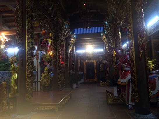 Hàng cột trang trí trong đền thờ làm bằng gỗ, trạm trổ tinh xảo với các điểm nhấn là những chi tiết sơn son thếp vàng.